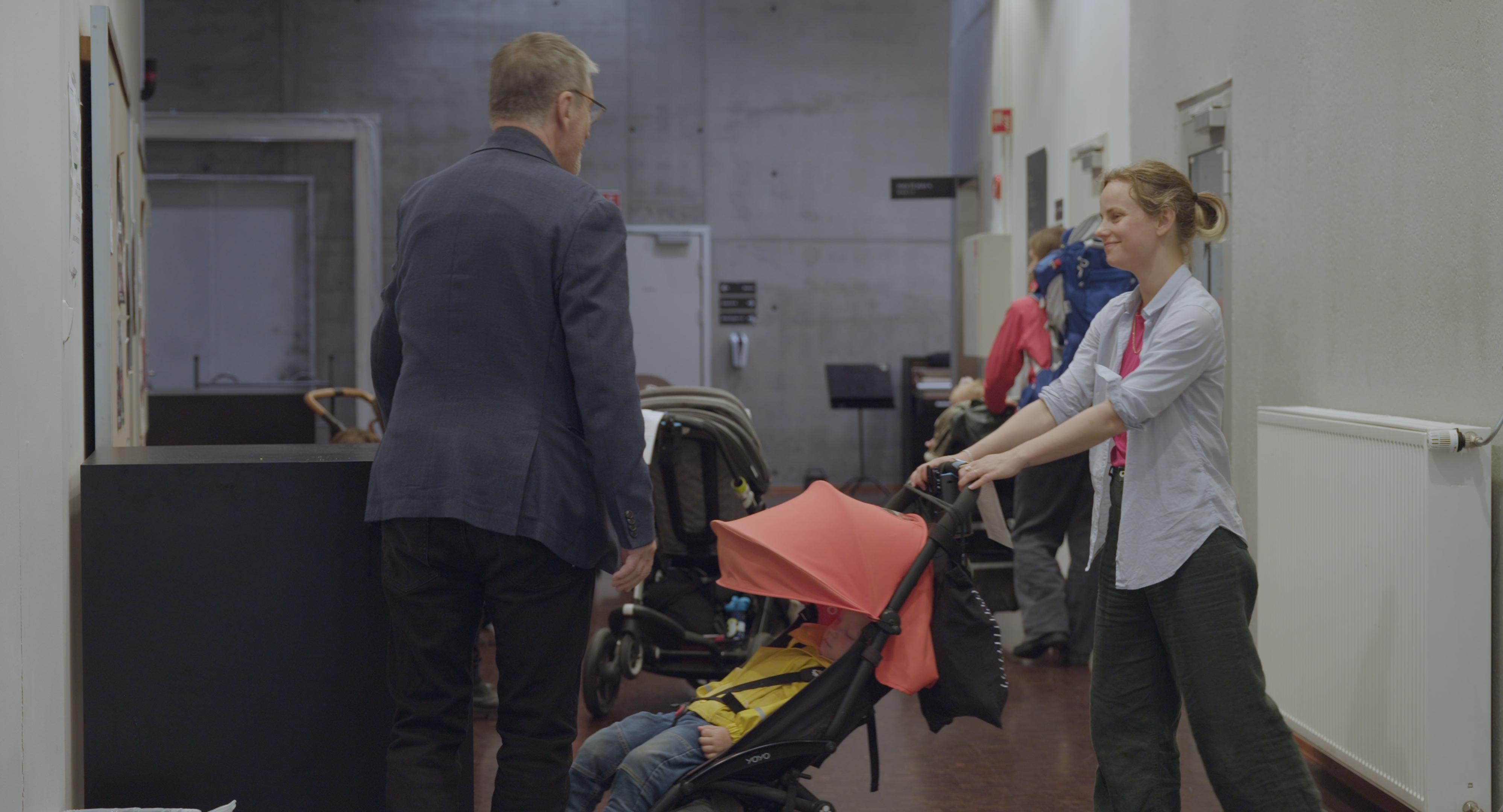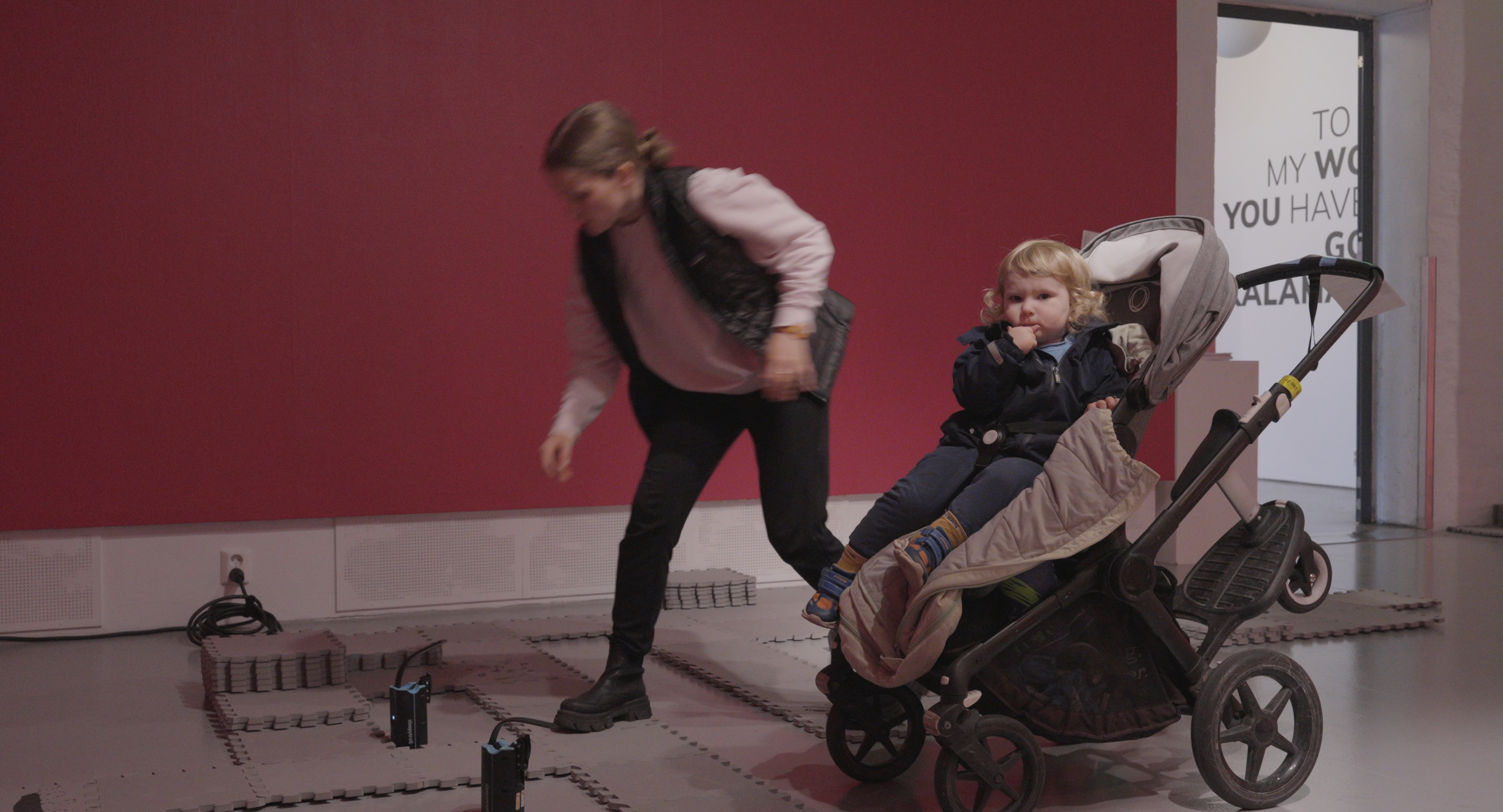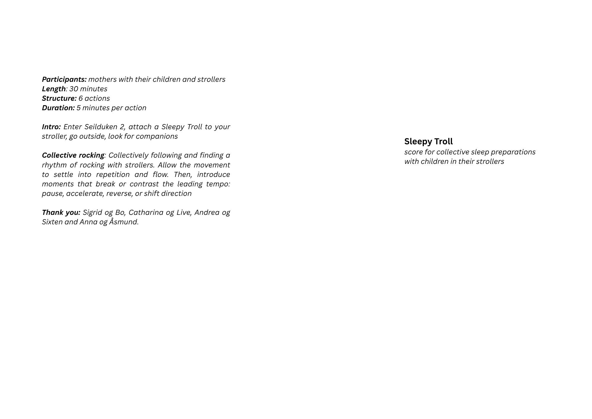 Sleepy Troll is a performance in which a group of mothers carry out a choreographic score. They arrive, each with their child (aged 0-3) in a stroller. As the first action, every mother picks up a small rocking device–the “Sleepy Troll”-and mounts it on their stroller. The piece reflects on the everyday rituals surrounding infant sleep and how caregiving bodies move through and adapt to public and institutional spaces. Sleepy Troll is a site-sensitive response to KHIO, highlighting the institutional gaps in childcare support within the building.
