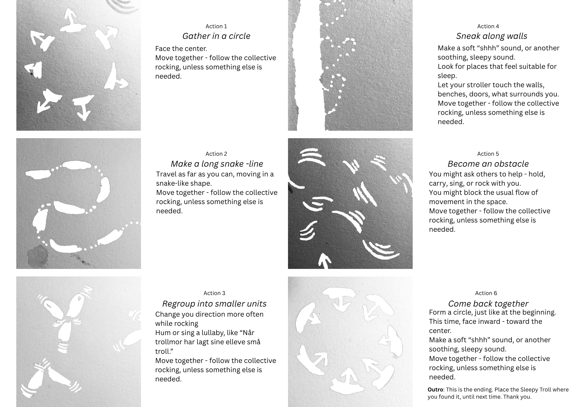 Collective rocking: Collectively following and finding a rhythm of rocking with strollers. Allow the movement to settle into repetition and flow. Then, introduce moments that break or contrast the leading tempo: pause, accelerate, reverse, or shift direction