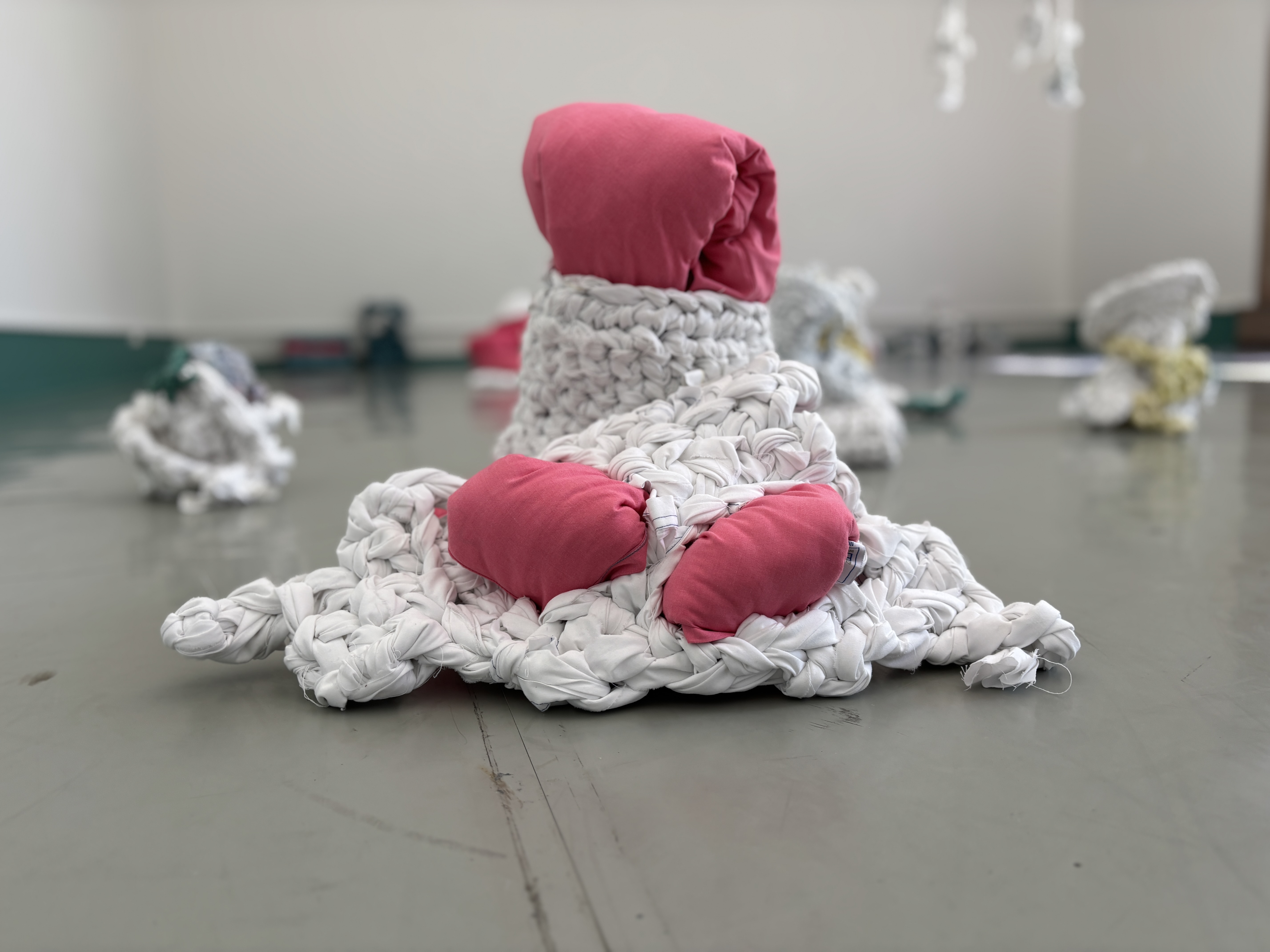 Knot was a workshop and gathering space for caregivers and their children (ages 0–3). The floor was covered with small textile sculptures made from loose parts—pipes, hoses, lumps, and circles—creating a soft, changeable landscape that was continuously rebuilt through play and interaction.